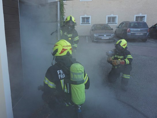 Übungsannahme war ein Brand in eine Tischlerei. Eine Person musste durch einen Atemschutztrupp aus dem verrauchten Gebäude gerettet werden, eine weitere Person wurde mithilfe der Teleskopmastbühne aus dem 1. OG gerettet.